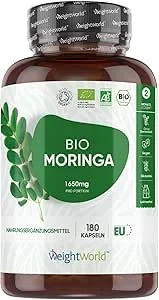 Bio Moringa - 1650mg Moringa Oleifera Pulver - 180 vegane Kapseln für 2 Monate - Zertifiziertes Superfood - 3 Kapseln Täglich - Geprüfte Zutaten, Ohne Zusätze & Gentechnik - WeightWorld